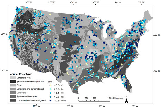 Spatial distribution of long-term average BFI (fraction) of sites with accepted OHS models (n = 825), presented among aquifer type within the CONUS. The average BFI values are variable throughout the CONUS, without distinct regional patterns.