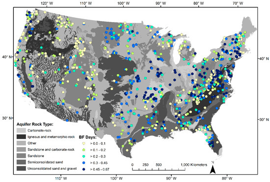 Spatial distribution of BF Days (fraction) of sites with accepted OHS models (n = 825), presented among aquifer type within the CONUS. The western US has a generally smaller fraction of days at base flow on average than the Midwest and eastern US.