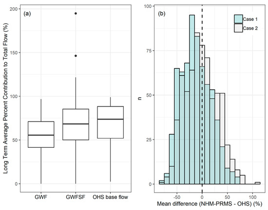 (a) Long-term average distributions of percent contribution from GWF, GWFSF, and OHS base flow to total outflow and (b) distributions of the mean difference between GWF and OHS base flow (case 1) and mean difference between GWFSF and OHS base flow (case 2). Instances of >100% average contribution to streams are due to the comparison of HRU-based volumes with routed-based stream segment volumes (n = 6 out of 662 sites compared).