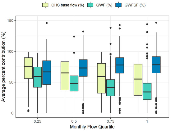 Average monthly percent contribution to total flow of OHS base flow, GWF, and GWFSF over normalized monthly flow quartiles (0.25, 0.5, 0.75, 1). Values greater than 100 percent are due to the comparison of HRU-based volumes with routed-based stream segment volumes (n = 6 out of 662 sites).