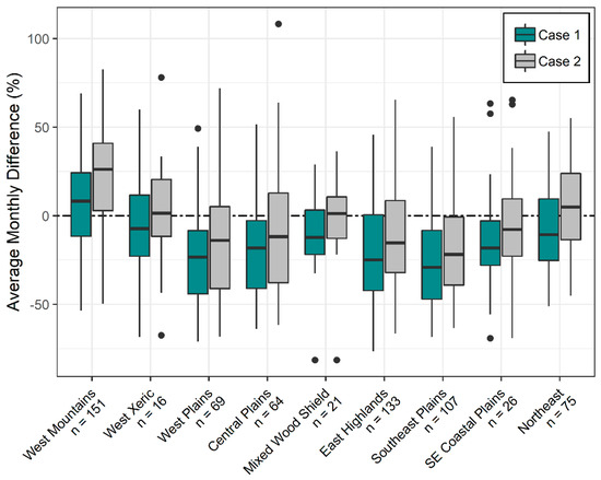 Average monthly difference in percent contribution from GWF and OHS base flow (case 1; teal) and GWFSF and OHS base flow (case 2; grey) over aggregated ecoregions [34]. Values greater than 100 percent are due to the comparison of HRU-based volumes with routed-based stream segment volumes (n = 6 out of 662 sites). The dotted line emphasizes a zero difference.