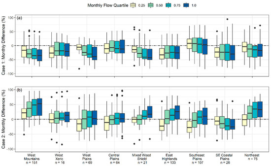(a) the difference in average monthly percent contributions to total flow of GWF and OHS base flow (case 1), and (b) GWFSF and OHS base flow (case 2) over normalized monthly flow quartiles (0.25, 0.5, 0.75, 1) and aggregated ecoregions [34]. Values greater than 100 percent are due to the comparison of HRU-based volumes with routed-based stream segment volumes. The dotted line emphasizes a zero difference.