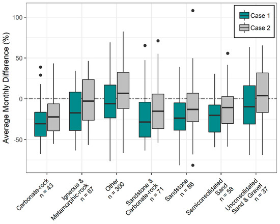 Average monthly difference in percent contribution from GWF and OHS base flow (case 1; blue) and GWFSF and OHS base flow (case 2; grey) over aquifer rock type [57]. Values greater than 100 percent are due to the comparison of HRU-based volumes with routed-based stream segment volumes (n = 6 out of 662 sites). The dotted line emphasizes a zero difference.