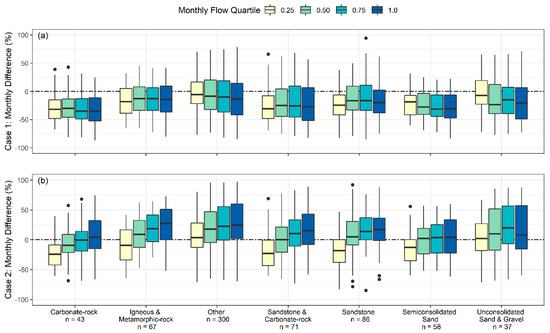 (a) The difference in average monthly percent contributions to total flow of GWF and OHS base flow (case 1), and (b) GWFSF and OHS base flow (case 2) over normalized monthly flow quartiles (0.25, 0.5, 0.75, 1) and aquifer type [57]. Values greater than 100 percent are due to the comparison of HRU-based volumes with routed-based stream segment volumes. The dotted line emphasizes a zero difference.