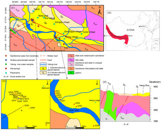 (a) location of the Himalayan geothermal belt and the study area [], (b) Geological setting of the Ganzi geothermal field, (c) sampling sites, (d) cross section of the Ganzi region.