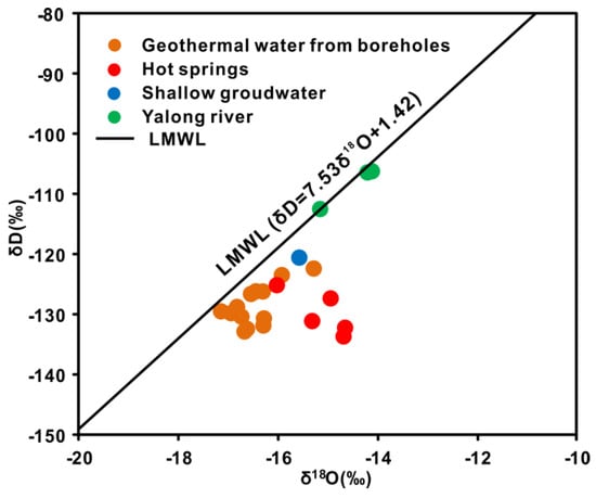 δD vs δ18O plot shows the isotopic composition of all water samples from the Ganzi geothermal field. LMWL stands for the local meteoric water line (δD = 7.53δ18O + 1.42) in Chengdu, Sichuan province [].