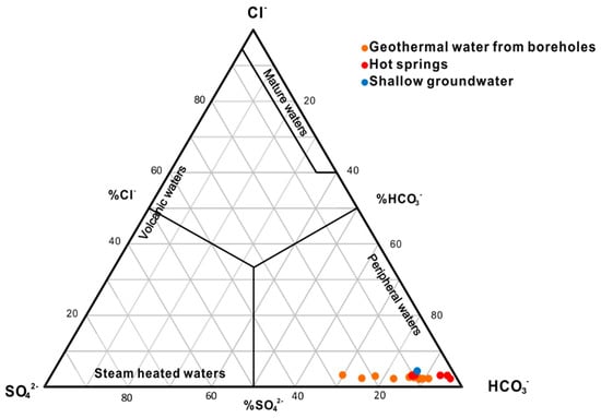 The results of the field tests (pH, temperature, EC, TDS) and laboratory analyses (major ion concentrations) are shown in Table 1. According to the properties and chemical composition of the samples, water samples are separated into geothermal water, shallow groundwater and river water. Geothermal water includes hot springs and geothermal water from boreholes. The infrared temperature of the geothermal water is 40–89 °C. The depth of the geothermal boreholes ranges from 30 to 180 m. The geothermal waters are alkaline, with a pH of 7.4–9.4. The TDS values range from 326 to 1798 mg/L, with an average of 787 mg/L. The Piper diagram shows that the hydrochemical types of the geothermal water are HCO3-Na and HCO3·SO4-Na (Figure 3). The shallow groundwater was collected from a well with a depth of 20 m. The hydrochemical type is HCO3-Na·Mg, and the water has a pH of 8.1 and a TDS value of 285 mg/L. The river water is alkaline, with a pH of 7.3–8.4. The TDS values are low, ranging from 119 to 281 mg/L. The water types of river water are HCO3-Ca·Mg, HCO3·SO4-Ca·Na·Mg, and HCO3·SO4-Ca·Mg. A geological investigation indicates that the river water is mainly recharged from surrounding mountain snowmelt and precipitation. Based on the Cl−-SO42−-HCO3− diagram [], all samples are classified in Figure 4. All the geothermal waters fall in the peripheral water field, and the water samples have a high content of HCO3−.