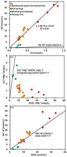 A molar ratio of Na+/Cl− equal to 1 is usually attributed to halite dissolution. The correlation diagram shown in Figure 5a shows that the Na+/Cl− molar ratio is much higher than 1. Therefore, an additional source of Na+ exists and may be related to the dissolution of silicate minerals in metamorphic sandstone and slate at depth []. In addition, if Ca2+, Mg2+, HCO3− and SO42− only come from calcite, dolomite, and gypsum weathering, the milligram equivalent ratio of Ca2+ + Mg2+ and HCO3− + SO42− should be 1. However, the HCO3− + SO42− value is greater than the Ca2+ + Mg2+ value, and the excess HCO3− + SO42− must be balanced by Na+ (Figure 5b). The molar ratio of (Na+ + K+)/HCO3− is approximately 1:1 (Figure 5c). These results indicate that the hydrochemical composition is likely mainly controlled by the dissolution of silicate minerals. Subsequently, the weathering of silicate minerals is estimated based on geothermal water with mineral phase equilibrium analysis [,].