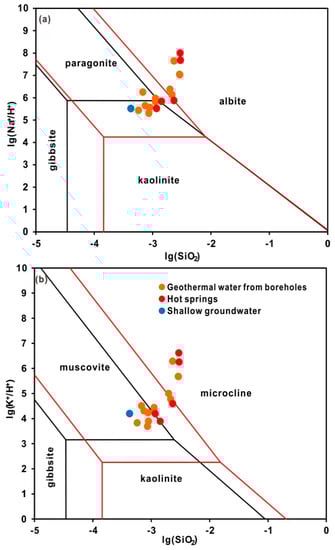 The chemical activity plots of the Na2O-Al2O3-SiO2-H2O system and the K2O-Al2O3-SiO2-H2O system are shown in Figure 6. The interaction between hot water and aluminosilicate minerals occurs throughout the rocks underground. The accumulation of chemical elements in solution by the dissolution of endophytic minerals leads to the formation of secondary minerals. Thus, the system can achieve chemical equilibrium and dynamic equilibrium, and establish a balance between the number of elements entering and precipitate from the solution. The water samples all lie in the stability field of albite and paragonite, indicating that Na+ is mainly subject to the dissolution equilibrium of these two minerals (Figure 7a). K+ is mainly controlled by the dissolution equilibrium of muscovite and microcline (Figure 7b). The thermal waters reveal an equilibrium with aluminosilicate minerals, which are predominant in the Triassic reservoirs in the research area. Moreover, Na-HCO3 waters are common in geothermal systems associated with metamorphic rocks with high CO2 contents [,]. Therefore, the high concentrations of Na+ and K+ in the geothermal water is due to the dissolution of silicate minerals, including albite, paragonite, muscovite and microcline, by CO2.