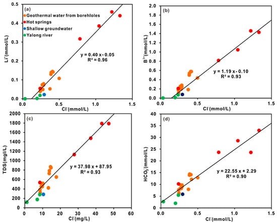 (a) Li+ vs. Cl− correlation plot (b) B3+ vs. Cl− correlation plot (c) total dissolved solids (TDS) vs. Cl− correlation plot, (d) HCO3− vs. Cl− correlation plot for water samples.