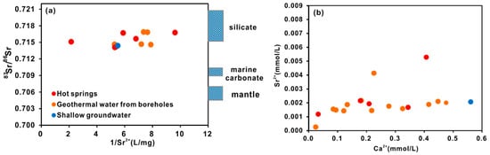 (a) The diagram of 87Sr/86Sr ratio vs 1/Sr2+ for waters from Ganzi. The 87Sr/86Sr ratios of marine carbonates range from 0.707–0.709 [,,]. The 87Sr/86Sr ratios of the silicate rocks in the Yangtze valley in China are usually >0.715, as referenced from Wang et al. (2007) []. The 87Sr/86Sr ratios of the mantle are 0.702–0.705 [], (b) Sr2+ vs Ca2+ plot.