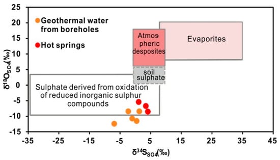 In the geothermal water, sulphate is the second major dissolved anion, with an average concentration of 79.8 mg/L. The maximum concentration of SO42− reached 213.3 mg/L. Sulphate has a wide variety of sources, including natural and anthropogenic sources. The geological constituents, including dissolution of sulphate-rich evaporites, oxidation of sulphides and meteoric precipitation, are the major natural sources [,]. Sulphur isotopes can be used to discriminate among the different sources and provide a description of the sulphur cycle. Therefore, the δ34SSO4 values, together with δ18OSO4, are used to help us understand the behaviour of sulphate in the geothermal water.