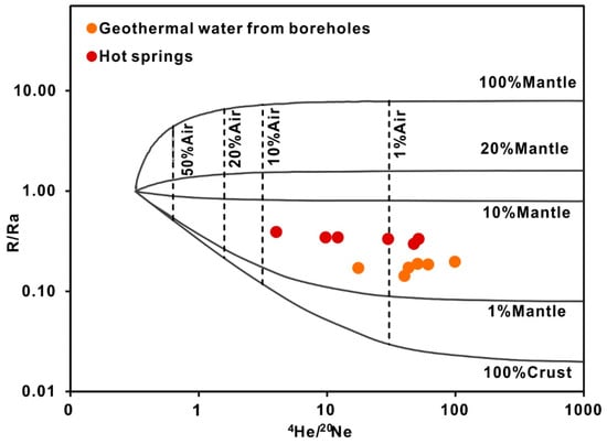 Noble gases can be used as a basic indication of gas origins due to their chemically inert nature. Helium is an excellent tracer for demonstrating the influence of crustal and mantle volatiles [,,]. 3He is derived from the mantle, and 4He is mainly produced by the radioactive decay of U and Th in the crust [,]. Therefore, the ratio of 3He/4He can be used to study the material source contribution ratio of the crust and the mantle in geothermal systems. The 3He/4He ratio is usually expressed by R, and the 3He/4He ratio in the atmosphere is usually expressed by Ra. The value of Ra, i.e., 1.384 × 10−6, is basically constant []. The R/Ra ratio in the mantle (represented by mid-ocean ridge basalt, MORB) is approximately 8 [,]. However, the R/Ra ratio in the crust rarely exceeds 0.02 []. Gas isotope geochemical analyses also use the 4He/20Ne ratio to determine the influence of the atmosphere on samples. The 4He/20Ne isotope ratio in the atmosphere is approximately 0.318 []. The air pollution of most gas samples is less than 1%, and for individual samples, it is less than 10% (Figure 10). The 4He/20Ne isotope ratios of the crust and the mantle are both approximately 1000 []. The plot of the R/Ra ratio versus the 4He/20Ne ratio can be used to identify the gas origin (Figure 10). Samples from the Ganzi geothermal fluid yield 3He/4He ratios of 0.17−0.39 Ra, indicating that no more than 5% of the He is derived from a mantle source. The contribution of mantle material to the gas in this system is very weak. Thus, the He mainly comes from atmospheric and crustal sources.