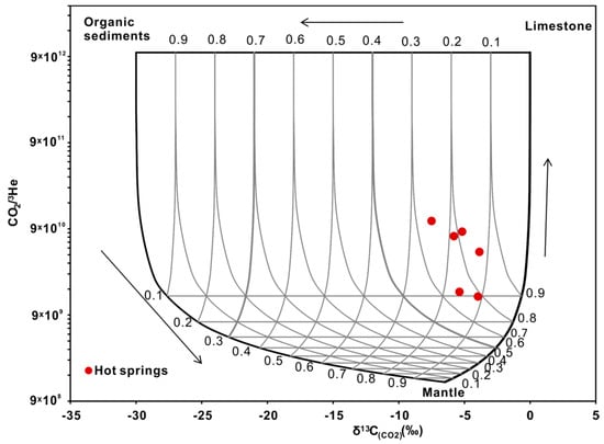 The study of the carbon isotopic composition of geothermal gases is of great significance for determining the origin of CO2 and understanding the genesis of the geothermal system []. There are three main sources of CO2: marine limestone, sedimentary organic carbon and mantle components []. These carbon end members have different δ13CCO2 isotopic compositions. The δ13CCO2 value of marine limestone is close to 0‰, that of sedimentary organic carbon is low, i.e., less than −20‰, and that of gas derived from the upper mantle is −6.5 ± 2.5‰ [,]. As shown in Figure 11, the carbon isotopic composition of CO2 and the CO2/3He ratio can jointly indicate the source of CO2 []. The contribution percentage of marine limestone to the CO2 in the geothermal gas is 74–86%, with an average value of 80%, and the contributions of sedimentary organic and mantle sources are markedly lower. Therefore, CO2 is mainly derived from the high-temperature metamorphism of marine carbonate rock. The contribution ratio of each end member is shown in Table 2. The study area features Carboniferous-Permian limestone beneath the Triassic sandstone and slate, and this limestone likely represents the source of the CO2 [].