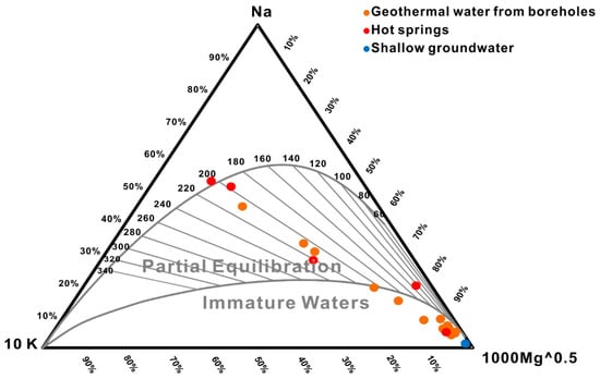 The various assumptions should keep in mind to predict subsurface temperatures in geothermal systems. The Na-K geothermometer is controlled by the equilibrium between the geothermal water and alkali feldspars. This relationship is consistent with the equilibrium minerals in the Ganzi geothermal field. The systems involving Na-K are likely to respond most slowly to temperature changes and to maintain deep equilibration temperatures. Also, Na-K geothermometer is unaffected by mixing with cold water during ascent. Due to the water cooling by conduction or boiling, the feldspars including albite and microcline re-equilibrate in response to the decrease of temperature. Even so, the Na/K ratio is not affected by conduction or boiling because aluminium is a governing factor for the precipitation of feldspar []. Therefore, the Na-K geothermometer should give a reliable result in the Ganzi geothermal field. The calculation results of Na-K and Na-Li geothermometers [] are shown in Table 3. The Na-K geothermometer provides an average reservoir temperature value of 192 °C, which is similar to the result from the Na-Li geothermometer of 198 °C. The Na-Li geothermometer is controlled by complete equilibrium reactions of mineral assemblages, including albite, K-feldspar and clay minerals []. Moreover, the most widely used cation geothermometer is the Na-K-Mg triangle diagram proposed by Giggenbach (1988) [], as shown in Figure 12. This method assumes that geothermal water has reached an equilibrium state in the reservoir with the mineral assemblage of albite, potassium feldspar, muscovite and chlorite in the surrounding rock. The Na-K-Mg ternary diagram can be used to classify hot waters as fully equilibrium with rocks, partially equilibrium, or immature. This indicates whether solute thermometers are suitable for geothermal water. A few water samples of Ganzi geothermal water are distributed near the fully equilibrated mineral dissolution line. In these cases, the water-rock reaction reached equilibrium, suggesting that the Na-K-Mg geothermometer is adequate for the study area. The reservoir temperature obtained from the Na-K-Mg triangle plot is approximately 200 °C. Water samples are distributed along the mixing line, indicating a tendency to mix with cold water. Given the good agreement between the results calculated by the Giggenbach diagram, Na-K and Na-Li geothermometer, the reservoir temperature of the Ganzi geothermal water can be approximately estimated to ca. 197 °C.