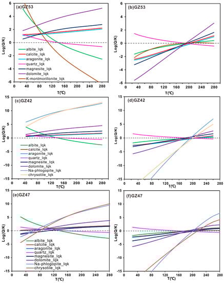 Variation in temperature with Log(Q/K) values of minerals for the original water samples (a) GZ53, (c) GZ42, (e) GZ47. Variation in temperature with Log(Q/K) values of minerals corrected for CO2 degassing for original water samples (b) GZ53, (d) GZ42, (f) GZ47. For discussions on methodology, see Pang and Reed, 1998 [].