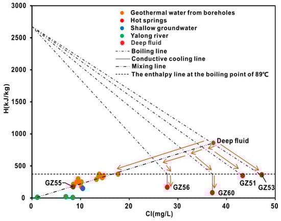 The Cl-enthalpy plot is very useful for evaluating the detailed cooling processes experienced by geothermal fluids during the ascent process []. The cooling processes of geothermal water rising to the surface mainly include adiabatic boiling, conductive cooling and mixing with cool water. The geothermal fluid may have experienced one or a combination of these processes. Cl− is a conservative element that can indicate the mixing process of geothermal fluids. The enthalpy of the hot water in the zone of mixing is less than the enthalpy of the hot water at depth owing to the escape of steam during ascent. Therefore, the appropriate reservoir temperature and Cl− concentrations of the deep geothermal fluids can be evaluated by the Cl-enthalpy mixing model [,]. Several simplifying assumptions are made when applying the Cl-enthalpy mixing model. (i) Mass and heat conservation are always assumed during and after mixing. (ii) It is assumed that the chemical reactions that occur after mixing are negligible and do not alter the water composition. (iii) More importantly, the mixing model can only be applied if the sampled waters are truly mixed. This has been proved according to the linear correlations between major ions and Cl−, which show a binary mixing line between the shallow water and deep geothermal fluid. Then, a diagram of enthalpy against Cl− concentrations for water samples is presented in Figure 14.