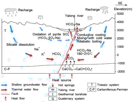 According to the geological setting and hydrochemical and isotopic data, a conceptual genetic model of the geothermal fluid of the Ganzi area is proposed in the schematic diagram of Figure 15. The geothermal water is recharged by snow melt water from surrounding high mountains. The recharge elevation is estimated to be 4233 m or 3794 m based on different altitude-dependent isotopic gradients. High mountains surround the study area, and Zhuonashan peak (5200 m) to the south features the highest elevations. The infiltrated water flows through the Tertiary silicate reservoir and combines with CO2 derived from deep marine metamorphic carbonate to form the HCO3-Na hydrochemical type. On the basis of 86Sr/87Sr data, it is can be deduced that the waters flow through the silicate reservoir. Long-term groundwater movement at depth results in the absorption of heat from the surrounding hot rock, producing a deep fluid with high temperatures of approximately 180–210 °C. The estimated circulation depth is approximately 5–6 km. Along the pathway of the groundwater flow, sulphate is formed due to oxidation of sulphides in the shallow rocks. Quaternary deposits comprising fluvial alluvium and glacial deposits serve as cap rocks for the geothermal system. The geothermal fluid rises to the surface through deep faults and fractures, which can be regarded as hydrothermal channels. The hot springs and geothermal wells are located along a NW-oriented fault. During the ascent of the waters, the hot water experiences mixing with cool water, adiabatic boiling, and conductive heating and emerges through the subsidiary fractures near the surface. These processes induce chemical composition re-equilibration and changes in the temperature, resulting in the geothermal fluid that emerges at the surface.