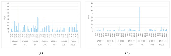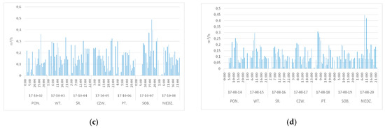 The number of inhabitants, the total water consumption during the year and water demand per unit was determined for each building. The following graphs (Figure 1) present hourly water consumption for four selected buildings, for weekly periods in which the maximum values of the measured volumetric flow were observed.