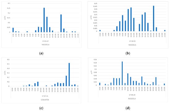 Examples of variability of hourly water consumption in a day with maximum demand in selected single-family houses: (a) Building No. 1, (b) building No. 6, (c) building No. 7 and (d) building No. 9.