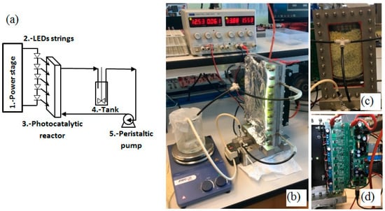 (a) Scheme of experimental system; (b) Experimental setup; (c) details of flat-plate reactor filled with N-TiO2/PS catalyst (front view); (d) DC/DC single ended primary inductor converter (SEPIC) regulator feeding 8 parallel strings, each one made by 10 visible light LEDs in series.