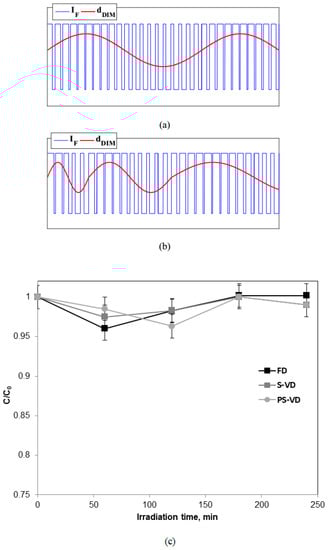 Preliminary tests were carried out in order to verify that the observed degradation of the target pollutant was attributed to the photocatalytic activity of the N-TiO2/PS catalyst. Specifically, analysis was conducted, in the absence of the photocatalyst, on the stability of urea (initial concentration equal to 250 mg/L) in distilled water under visible light irradiation at fixed duty (FD) LED dimming and by using sinusoidal-variable duty (S-VD) and pseudosinusoidal-variable duty (PS-VD) LED dimming modulations (Figure 2). In the FD LED dimming mode, the ON state LED current was regulated at 200 mA. In this case, the LEDs irradiated about 62.5% of their nominal luminous flux (in the range 61–71 lm per LED). In the S-VD LED dimming modulation and PS-VD LED dimming modulation, the ON state LED current was modulated between 100 and 300 mA. In this case, the LEDs irradiated between 37.5% and 87.5%, respectively, of their nominal luminous flux. IF is the LED forward current in the ON state. Ts is the dimming period, corresponding to the periodic interval of time wherein the LED is alternately turned ON and OFF, so that its forward current IF switches alternately between a given ON state value and zero in a way depending on the dimming modulation implemented (see the blue curves in Figure 2a,b). tON is the LED ON time interval, corresponding to the fraction of the dimming period Ts, wherein the LED is in the ON state and generates light irradiation. dDIM = tON/TS is the LED dimming duty cycle, corresponding to the relative fraction of the dimming period Ts, wherein the LED is in the ON state and generates light irradiation.