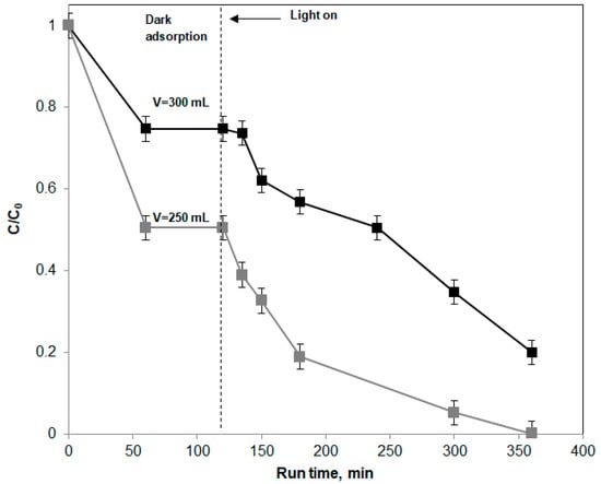 Figure 3 shows the behavior of urea degradation in distilled water during the dark phase and under irradiation time using FD LED dimming (48 W, 200 mA) and by varying the volume of polluted water to be treated. Differently from the photolysis tests (Figure 2), degradation of urea occurred in the presence of the N-TiO2/PS photocatalyst and under visible light irradiation. Before the photoreaction (dark phase), at 250 and 300 mL solution volumes, about 50% and 29% of initial urea was adsorbed, respectively, on the surface of N-TiO2/PS.