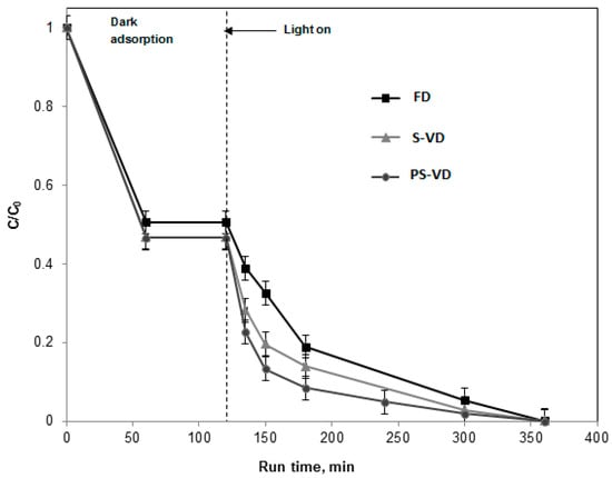 The value of the kinetic constant k can be calculated by the slope of the straight line obtained from plotting versus irradiation time (t). The highest value of k (0.0275 min−1) was obtained using the PS-VD LED dimming modulation, evidencing the existence of light modulation influences. In fact, the kinetic constant increased from 0.0207 min−1 for FD LEDs modulations to 0.0249 and 0.0275 min−1 for S-VD and PS-VD LEDs dimming modulations, respectively. Possibly, the FD LED dimming technique induces electron–hole recombination because of the high electron concentration, stopping the hole oxidation reactions and, thus, limiting the photocatalytic process []. On the contrary, using the S-VD LED and PS-VD LED dimming modulations, the improvement in photocatalytic performances may be ascribed to the depletion of oxygen being re-adsorbed onto the surface, with some re-adsorption of urea molecules onto the photocatalyst surface as well []. As a consequence, oxygen may subsequently react with the excess electrons, thus, inhibiting the recombination rate of photogenerated electrons and holes. However, further investigations are necessary to explain the improved results obtained with S-VD LED and PS-VD LED dimming modulations.