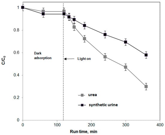 Finally, in order to check the influence of the substances different from urea present in the synthetic urine (whose composition is reported in Table 1), a photocatalytic test was performed using a water sample obtained by dissolving urea in distilled water until an initial urea concentration equal to that of the synthetic urine (25 g/L) was achieved.