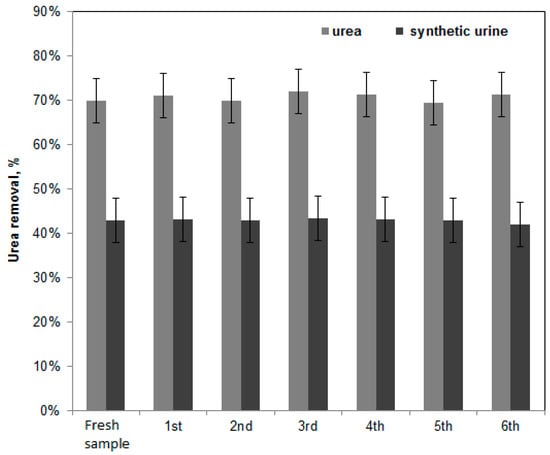 In order to verify the possible application of the proposed photocatalytic process in urea or urine treatment at full scale, it is important to evaluate the stability of the adopted system. Therefore, photocatalytic tests were performed for up to six reuse cycles in order to analyze the urea removal both in distilled water and in the synthetic urine water (Figure 6). Before each reuse cycle, no cleaning or regenerating steps were carried out on the used photocatalyst. The treated solution was only removed from the photoreactor, and a fresh solution with the same initial urea concentration was fed to the photoreactor for the new test.