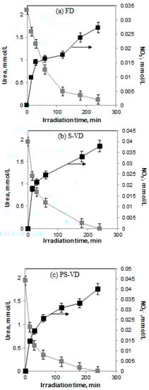 TiO2 and Pt/TiO2 are the most studied catalytic systems for the photodegradation of urea under UV irradiation [,]. However, no paper has been devoted to the photocatalytic degradation of urea under visible light.