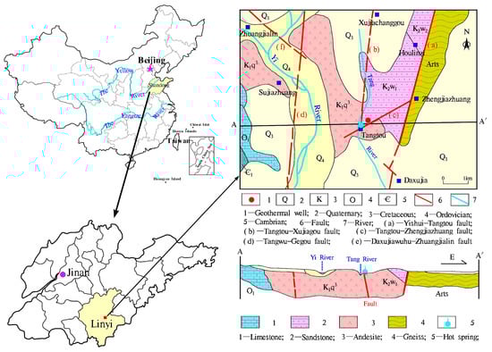 - Dong, Y.M.; Li, Z.H.; Chen, S.L.; Zhao, G.L. Geothermal resource exploitation, utilization and protection in Linyi segment of Yishu fault. Res. Dev. Mark. 2009, 25, 1031–1033. [Google Scholar]