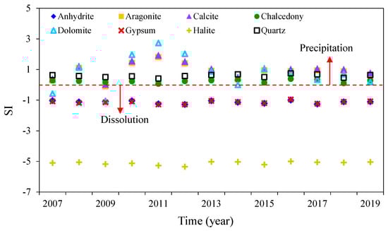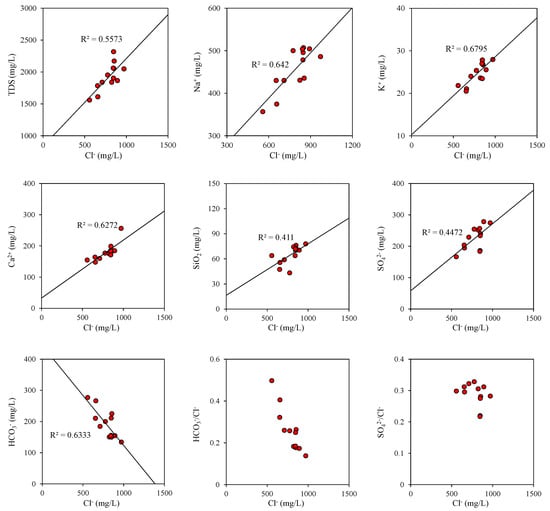 - A positive correlation was found between Cl− and Na+, K+, Ca2+, and SiO2, while Cl− and HCO3− had a significant negative correlation. Water-rock interaction in the process of runoff is the main factor controlling the chemical composition of geothermal water, as well as mixing processes. Calculated SI values indicated that the geothermal water was saturated with respect to quartz, chalcedony, dolomite, calcite, and aragonite, while unsaturated with respect to anhydrite, halite, and gypsum.
