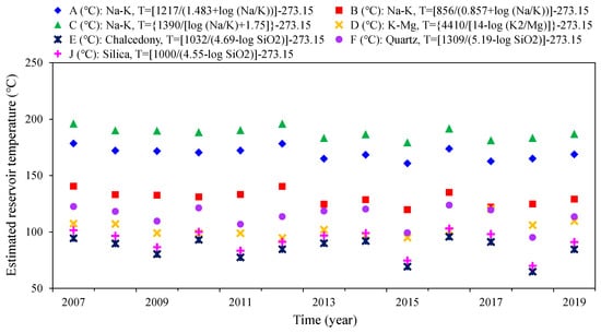 - Based on cation and silica chemical geothermometers, water temperatures estimated by the cation geothermometers ranged from 94.63 to 196.10 °C, while temperatures estimated the silica geothermometers from indicated a result of ranging from 69.13 to 123.75 °C. Na-K-Mg1/2 ternary diagram suggested that thermal water samples from 2007 to 2019 contain immature waters and partially equilibrated or mixed waters.