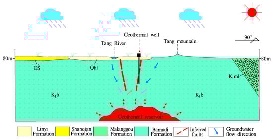 - Geothermal water passes through a long runoff path and a slower deep water cycle and rises through the tectonic fracture zone. The geothermal water was recharged by shallow underground cold water. At the intersection of Tangtou-Zhengjiazhuang fault and Tangtou-Xujiachanggou fault, the terrain is low-lying, the fissures are developed, and the geothermal water is blocked by the faults, which enriches in the deep underground near Tangtou.