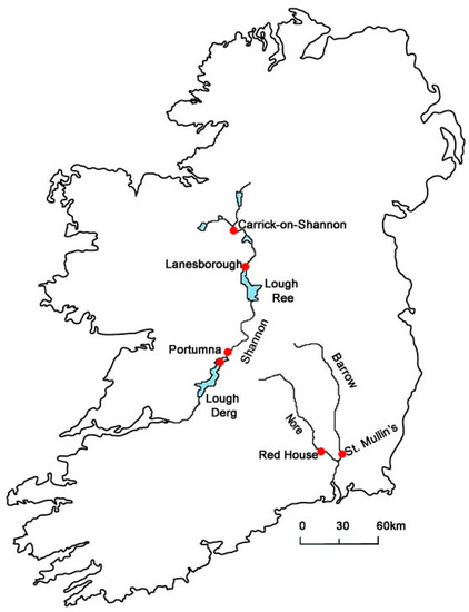 In Ireland, Corbicula clams were first detected in the River Barrow in 2010 [14], where an extremely high density of 17,872 individuals/m2 recorded at one sampling site in 2012 [15]. A subsequent investigation revealed its presence in the River Nore [16], which shares a common estuary with the River Barrow. Corbicula was also discovered in the Shannon system, Ireland’s major navigable waterway, at Carrick-on-Shannon [17], in Lough Derg and in the Shannon River section above Portumna upstream of Lough Derg [18] and at Lanesborough, upstream of Lough Ree (R. Sheehan, Pers Obs) (Figure 1).