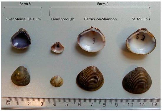 From the morphological characterization, all Irish Corbicula clams were visually determined as the European form R as described in [19,23] with a round deep shell that may range from externally dark to golden, heavy ridges and a generally white interior (Figure 2).