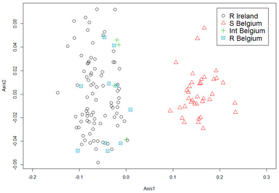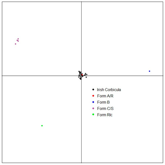 No clams with either a narrow and fine-ridged shell or deep purple interior, as corresponding to form S [19,40] were observed. The PCA analysis carried out on the ratio between shell length and shell height (Figure 3) supports the correct classification of these individuals a belonging to form R. Morphologically, all clams sampled from the Irish sites conform to the invasive form A/R as described in [11,21,23,28,29], with a certain variability observed (Figure 3).