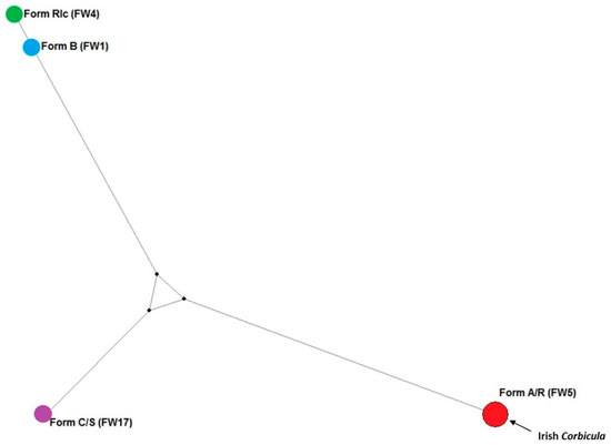 A fragment of 710 bp of the COI gene was amplified in 25 individuals, with representatives from each Irish location. Polymerase Chain Reaction (PCR) was carried out using the universal primers LCO1490 and HCO2198 [34] following the protocol described in [23]. Amplicons were purified and sequenced with the forward universal primer HCO2198 on an automated ABI 3730XL Genetic Analyzer (Genoscreen, Lille, France). Retrieved sequences were visualized, aligned and edited using BioEdit 7.0.5.3 [35]. Corrected sequences and published sequences of the invasive lineages (FW5—Form A/R: GU721082; FW1—Form B: AF196269; FW4—Form Rlc: GU721084; FW17—Form C/S: GU721083) were added to our dataset and used to construct a haplotype median-joining network using the Network 4.6.1.2. [36].