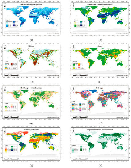 The RDLS is the difference between the highest altitude point and the lowest altitude point in the watershed. It represents an important indicator of regional topographical features and landform types. A global RDLS map with 90 × 90 m pixel size was created in ArcGIS. Based on the spatial statistics module of ArcGIS, the average slope of each watershed was obtained. The global distribution of RDLS for each fourth-level watershed is shown in Figure 2e.