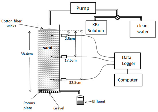 A cylindrical PVC tube of 60 cm length, beveled at its end to form a cutting edge, was sunk into the soil in the region of Bekalta in the east center of Tunisia. A homogeneous soil column of 38.4 cm length and 15 cm diameter has been carefully extracted. The soil, essentially formed by sand, was placed over a porous plate of 6 mm high with a saturated water content of 0.42 cm3 cm−3. The soil column (sand + porous plate) is set on a container filled with gravel (Figure 1). An orifice, located face to the soil bottom, allows effluent recovery and fixing the pressure head h [L] at the lower boundary to zero. The vertical axis Z is downward oriented with the origin located at the soil surface. Three tensiometric sensors, connected to a data logger and a computer, allow monitoring the pressure head near the top (Z1 = 2.5 cm), middle (Z2 = 17.5 cm), and bottom of the column (Z3 = 32.5 cm). The outflow bromide concentration is measured using an ion selective electrode (HI4102 from HANNA instruments). Initially, hydrostatic equilibrium is obtained by verifying that each tensiometer indicates a suction equal to its distance to the bottom of the column. A constant water flow rate of 14 cm3/min was applied at the top surface of the soil using a high-accuracy Masterflex® L/S peristaltic pump. Cotton fiber wicks were deposited at the surface of the soil to obtain a uniform distribution of the flow rate over the soil area. The tensiometric data and the cumulative outflow were monitored until t = 660 min. Infiltration occurs during a period of 562 min, it starts at t = 24 min and was stopped at t = 586 min. During a first period (24 min < t < 220 min), the pump injects a potassium bromide (KBr) solution from a reservoir with a concentration of 0.08 g/L. The period of injection ensures around one pore volume of injected KBr solution. Then, clean water was injected at the surface of the soil with the same flow rate for the period 220 min < t < 586 min. This ensures around two pore volumes of injected clean water. To limit evaporation, the upper end of the column was sealed with the exception of a small orifice, which ensures equilibrium with atmospheric pressure.