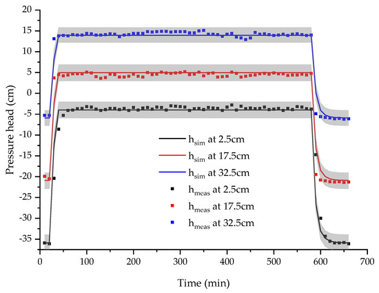 The flow system of Equations (1) and (2) is subject to the following boundary conditions. At the upper boundary, we impose a constant flux () during the injection period (24 min < t < 586 min); otherwise, the upper flux is zero. A zero-pressure head (Dirichlet boundary condition) is imposed at the column lower boundary. Initial conditions correspond to a hydrostatic pressure distribution .