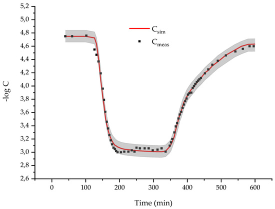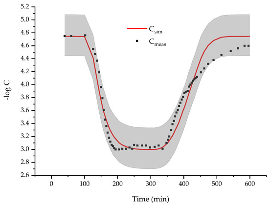 Measured and simulated output concentrations using the mean estimated parameter values obtained from the inversion of the mobile–immobile transport model are plotted in Figure 8. Contrary to the results of the linear transport model (Figure 3), a very good matching is observed between measured and simulated concentrations during the whole experiment (including the leaching phase). Furthermore, the total uncertainty (grey bands) characterizing the concentration output is much narrower with the mobile–immobile transport model (Figure 8) than with the linear one (Figure 3). Hence, for the investigated undisturbed soil, the mobile–immobile transport model better reproduces bromide infiltration and yields much more accurate output concentrations than the linear one.