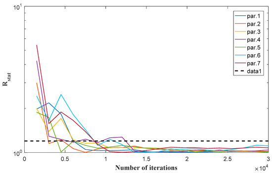 Convergence of the unsaturated soil parameters for the mobile–immobile transport model: Variation of the Gelman–Rubin (Rstat) with the number of iterations. The convergence is achieved if the chains reach the threshold in broken-line (Rstat ≤ 1.2).