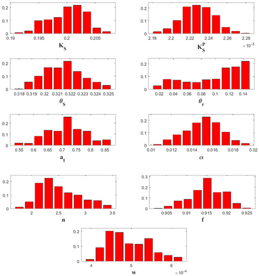 The results of this table show that, except the residual water content, all the parameters are well estimated since the posterior intervals of the estimated parameters (Table 2) are strongly narrowed, as compared to their prior intervals (given in Table 1). The significant difference between the prior and posterior distributions of a parameter testifies the high model sensitivity of this parameter. Furthermore, the marginal distributions of all soil parameters (except ) exhibit almost bell-shaped posterior distributions (Figure 5).