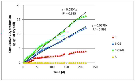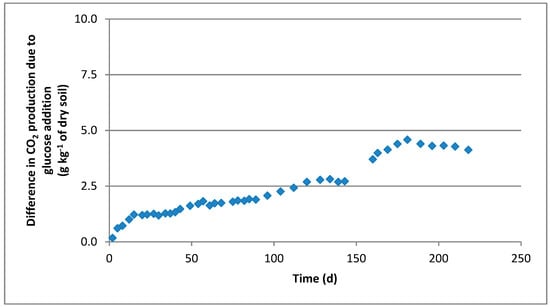 - Comparing the CO2 production of the BIOS and BIOS-G microcosms, the system with added glucose (BIOS-G) produced a higher amount, especially at the beginning of the test, and the difference increased until about 110 days, when the value was in the order of 2.4–2.5 g CO2 kg−1 of soil (Figure 3). This trend was also found after the second addition of glucose to BIOS-G at t = 143 days, when the BIOS-G microcosm started to produce CO2 more quickly than the BIOS microcosm (this feature ended at 163–165 days).