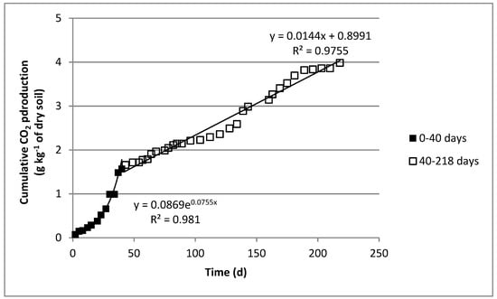 - The control biotic microcosm (C) had the highest respirometric activity in the first 35–40 days, with an exponential trend, then, the daily CO2 production continued but with a reduced amount (Figure 2). After 40 days, the cumulative CO2 quantity grew with an almost linear tendency, demonstrating that the daily production was almost constant and in the order of 0.014 g CO2 kg−1 of soil day−1. In both cases, the regression coefficient R2 had values very close to 1.