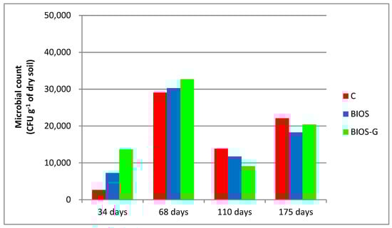 Soil samples of each microcosm were taken at t = 34, 68, 110, and 175 days to perform the viable microbial count on Malt Extract Agar (MEA) plates, in line with the method used by Bosco et al. []. The colony counting was performed after 3 days, and the results were expressed as the number of Colony Forming Units (CFU) per gram of soil.