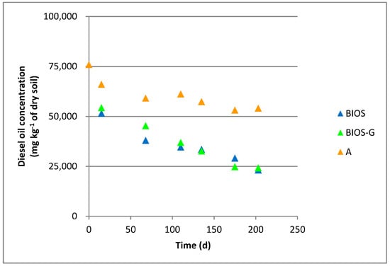 In a previous study carried out with the same soil contaminated with a commercial diesel oil (7.5% w/w soil) [], the effect of biostimulation was investigated. The results clearly showed that the medium favoring bacterial growth was more effective in promoting indigenous microbial activity (in terms of CO2 production and biomass dry weight). In a subsequent work [], the biodegradation efficiencies of biodegradation with and without the addition of a primary carbon source (e.g., glucose) were compared. The results in the biostimulated and bioaugmented microcosms were very similar. It was confirmed that biostimulation can be adopted as a strategy to remove aerobically high concentrations of diesel oil.