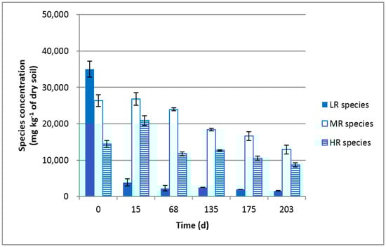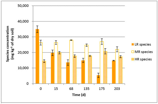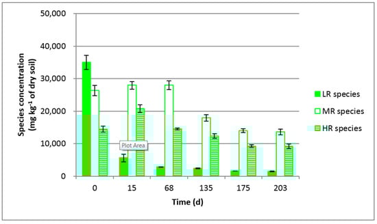 The removal of LR species was around 57% of the initial content (Figure 6). This occurred rather rapidly, and after about two months the LR species concentration remained at around 15,000 mg kg−1 of soil.